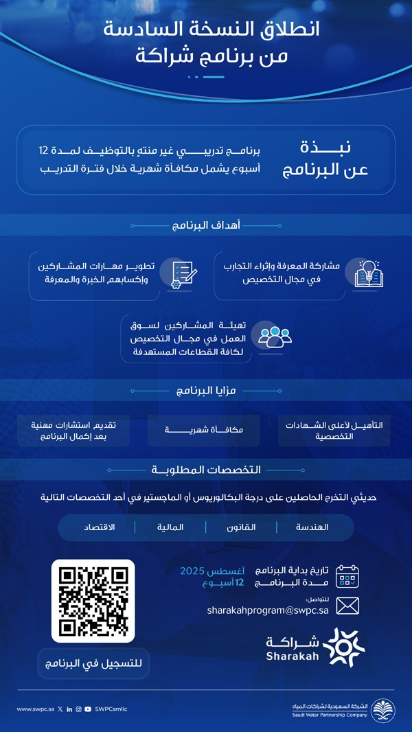 يسر الشركة السعودية لشراكات المياه ان تعلن عن إطلاق برنامج “شراكة” التدريبي بنسخته السادسة، وذلك ضمن مبادرات الشركة المجتمعية. يهدف البرنامج الى منح حديثي التخرج المهارات اللازمة لتهيئتهم لسوق العمل.